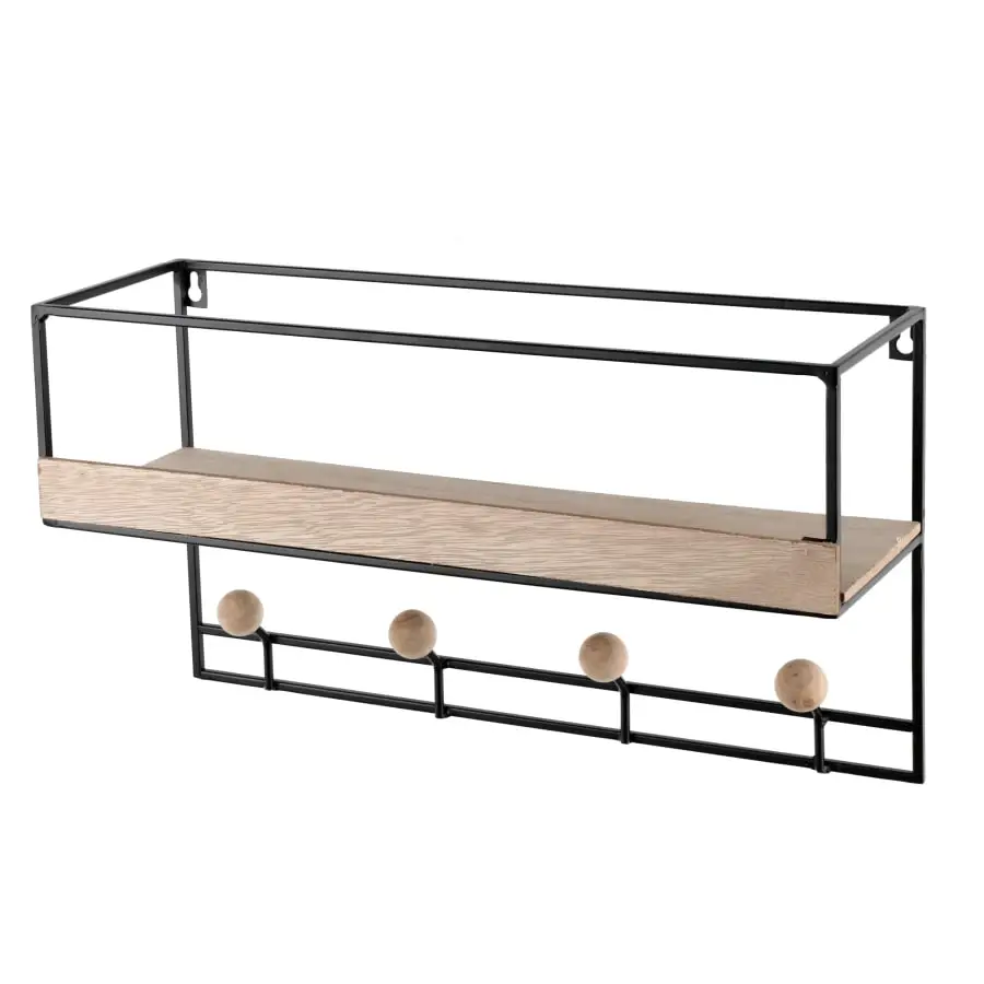 Stylish small shelf suitable for many spaces and uses. The shelf has a small edge, so items stay well on the shelf. Four wooden hooks. Maximum load 5 kg.