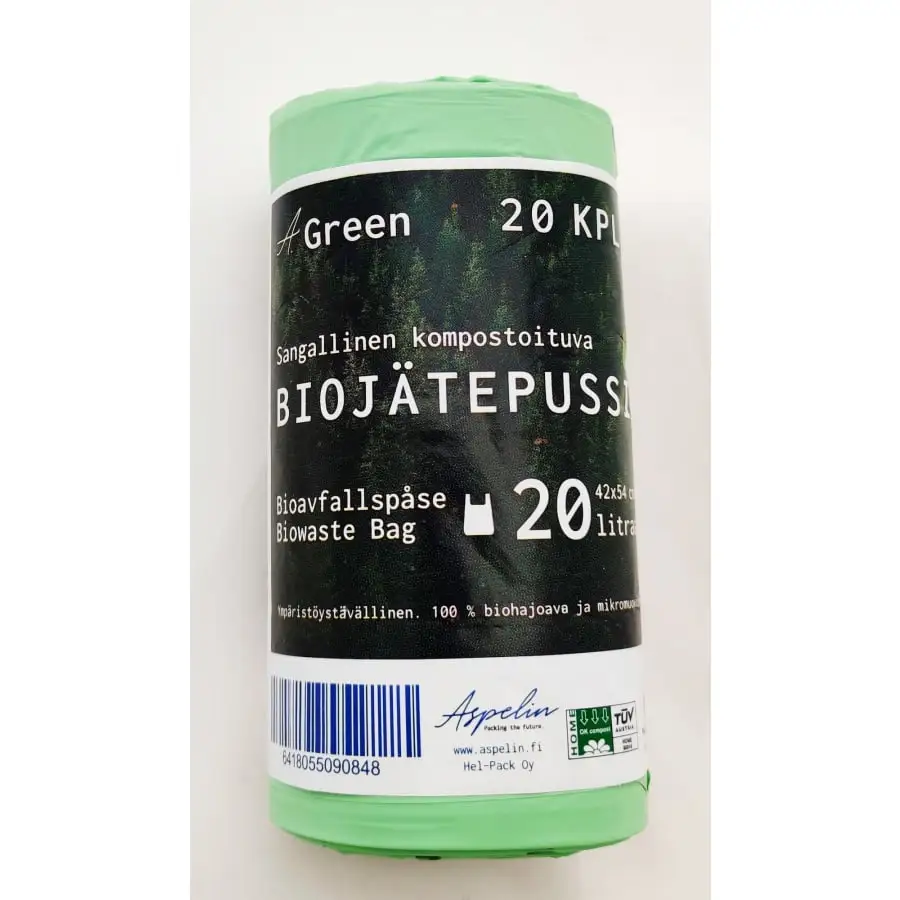 A. Green strapped compostable biowaste bag 20 liters. Size 42×52 cm, thickness 15 my. Made of certified mater-bi bio film that breaks down in home compost. 20 pcs in a roll.