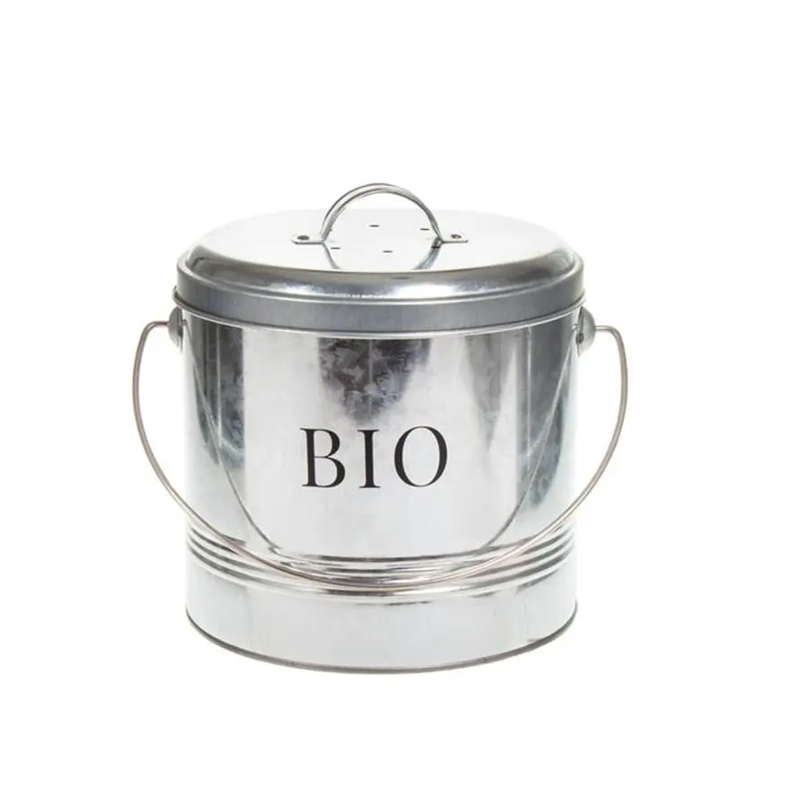 En kompostbehållare som är så vacker att den kan ställas ut i köket. Zinkfärgad plåt med den vita texten ’BIO’ på sidan. Storlek 19 x 17 cm.