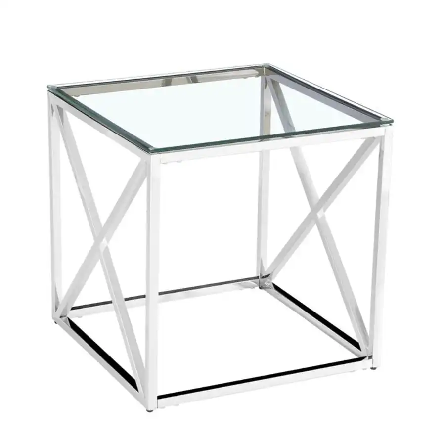 size: 55x55x55cm, legs material: stainless steel, glass: 8mm clear tempered glass