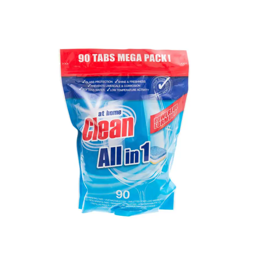 An effective all in one dishwashing tablet washes the dishes fresh and clean. The package contains 90 tabs. Made in the EU.