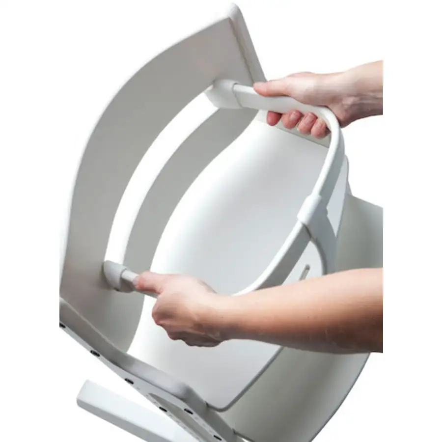 High chair with brace, strap, and harness. Adjustable seat and footrest to fit your child as he or she grows. Brace and strap can easily be mounted and removed without tools. Maximum stability and safety. Colour: white.