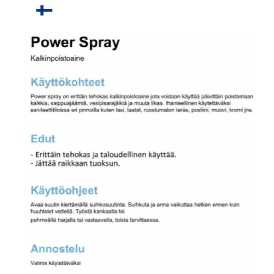 Power spray är en mycket effektiv kalkborttagare som kan användas dagligen för att ta bort kalk, tvålrester, vattendroppar och annan smuts. Idealisk för användning i sanitetsanläggningar på olika ytor som glas, kakel, rostfritt stål, porslin, plast, krom, etc.