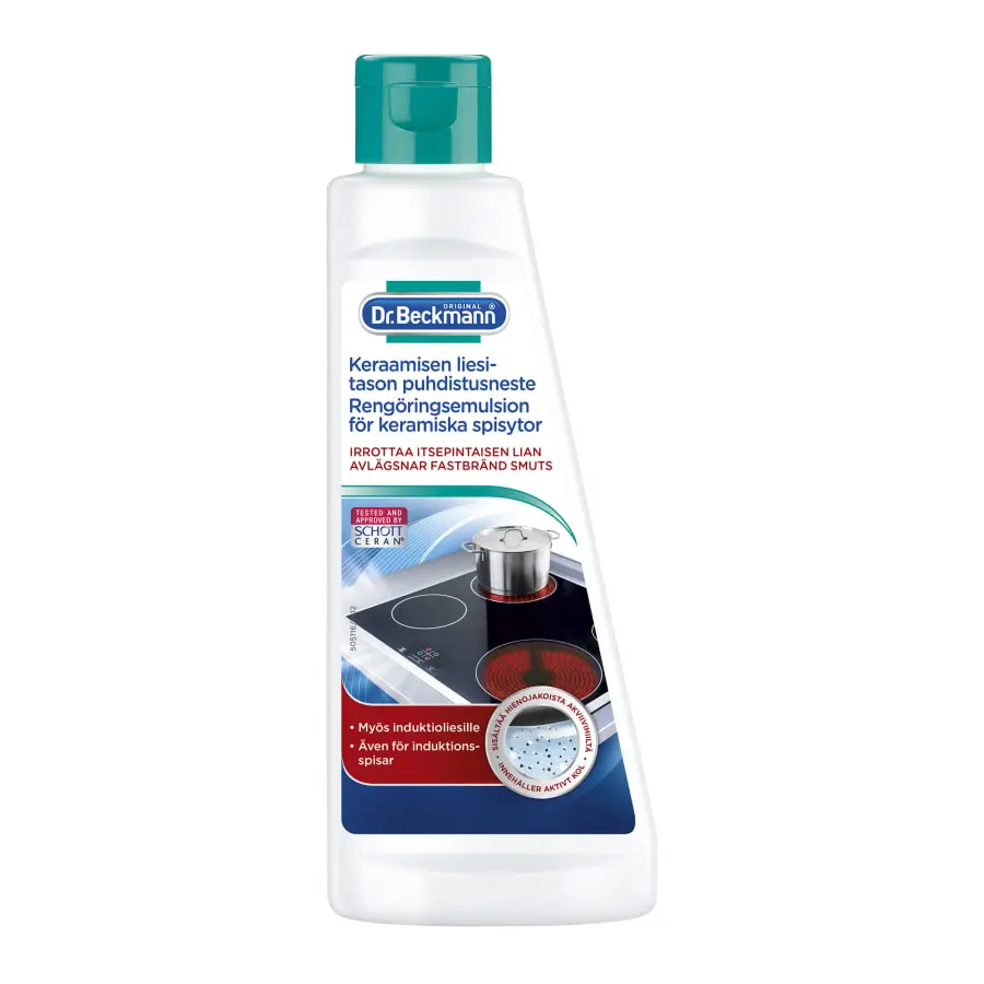 Removes burnt-on food. Free from microplastics, with natural polishing beads. With micro-fine activated carbon. Tested & approved by SCHOTT Ceran. Also for induction hobs.