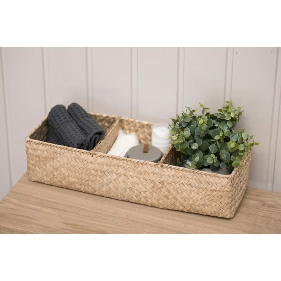 The stylish three-compartment seagrass basket is convenient for storing small items in the home and maintaining order. Excellent for small face towels, cosmetic bottles and many other items. The basket is sturdy and its structure is reinforced with a metal frame. Seagrass is a natural material and colour may vary.