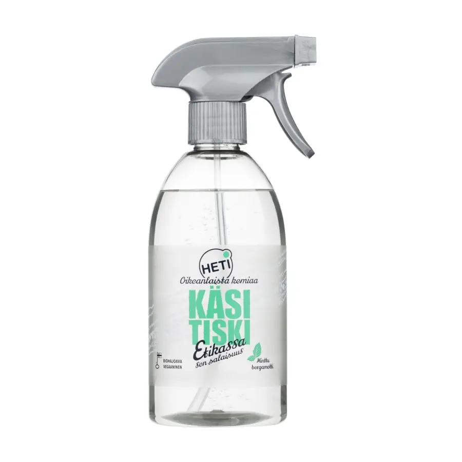 Snabbt och bekvämt handdiskmedel i sprayform. Enkel och snabb att använda och kräver inte mycket vatten för att skölja. Produkten som innehåller inhemsk Rajamäki-spritvinäger rengör och neutraliserar effektivt obehagliga lukter. Frisk citrus-bergamottdoft. Tillverkad med hövatten.