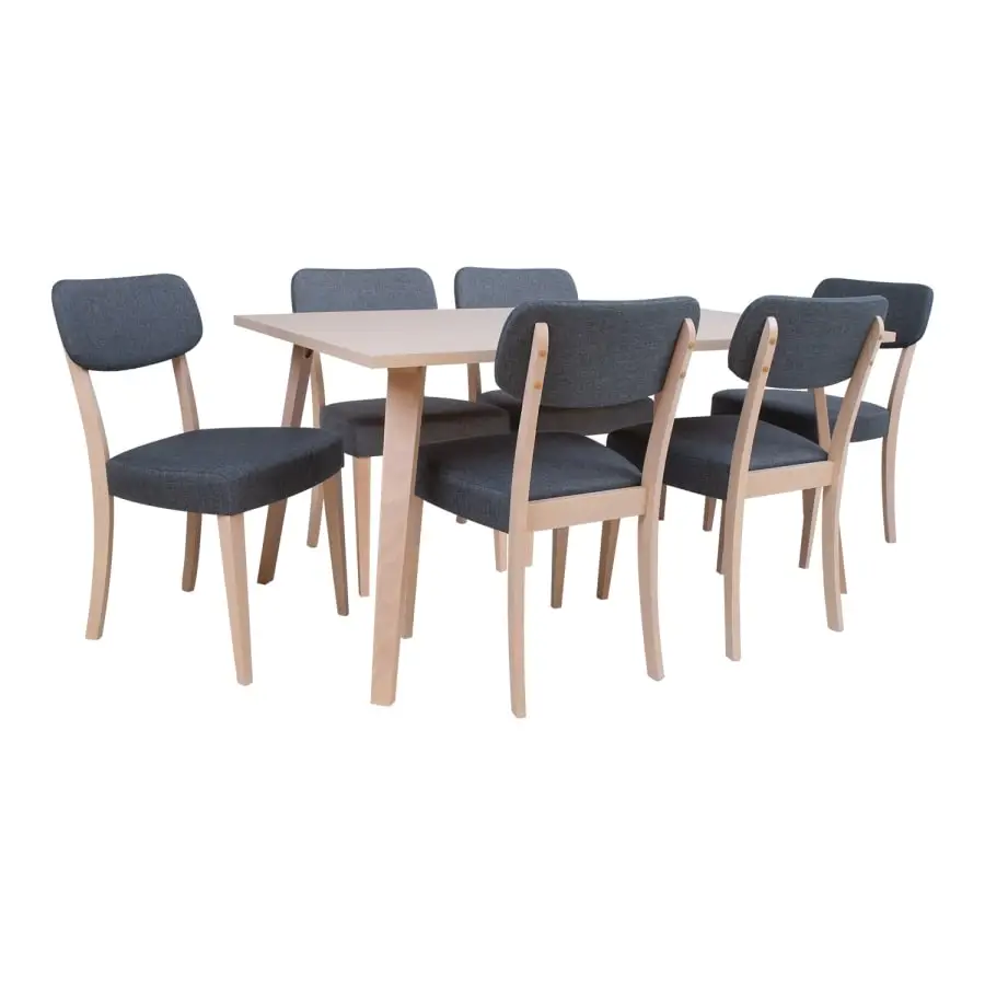 Dining group ADORA table and 6 chairs. Dining table ADORA 150x90xH73cm. The table top is made of honeycomb board and covered with natural beech veneer. Table top thickness 25mm. The legs and frame are made of whole beech wood. The table is finished with wood-tone white lacquer. Chair ADORA 49x58xH85.5cm, seat height 50 cm. The chair is made of solid beech. The seat and backrest are upholstered and covered with gray polyester fabric. The wooden parts are finished with wood-colored white lacquer. Weight limit 100 kg.