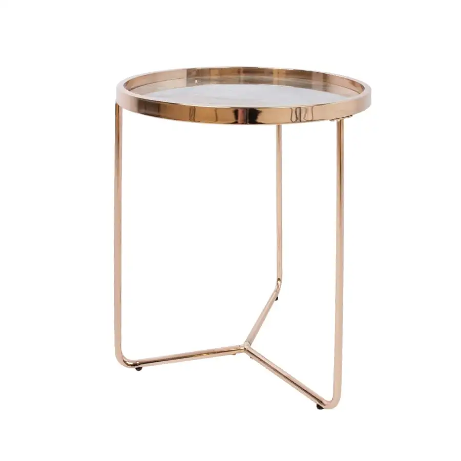 Side table ASTOR gold. A stylish and convenient side table helps every day and also makes it easier to entertain guests at home. The table top is made of 5 mm thick tempered glass with a luxurious marble pattern. The steel legs of the table are finished in an elegant golden tone. The dimensions of the side table are 45 x 49 cm.