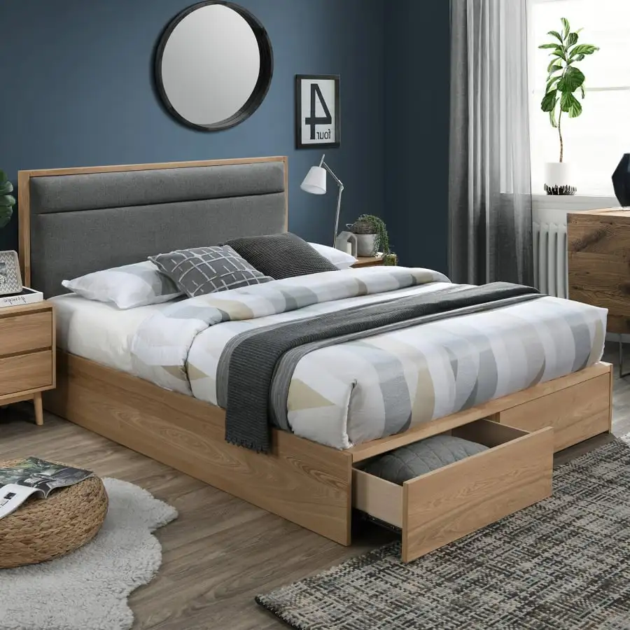 Bed Blossom 160×200 with two convenient storage boxes! The mattress is not included in the package. The bed frame is made of MDF board and covered with natural ash veneer and oak lacquer. Padded end covered with dark gray polyester fabric. There are 2 drawers on the foot side of the base frame. The baseboards of the bed are included in the price.