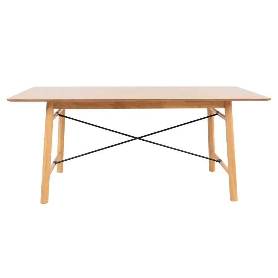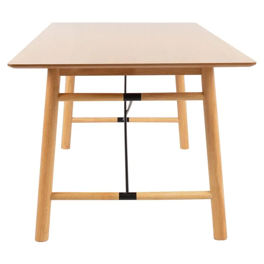 Graceful and stylish dining table Emerald. The table top is made of oak veneered MDF board. The legs and body are made of rubber wood. Black metal support structure. The table is finished with clear lacquer.