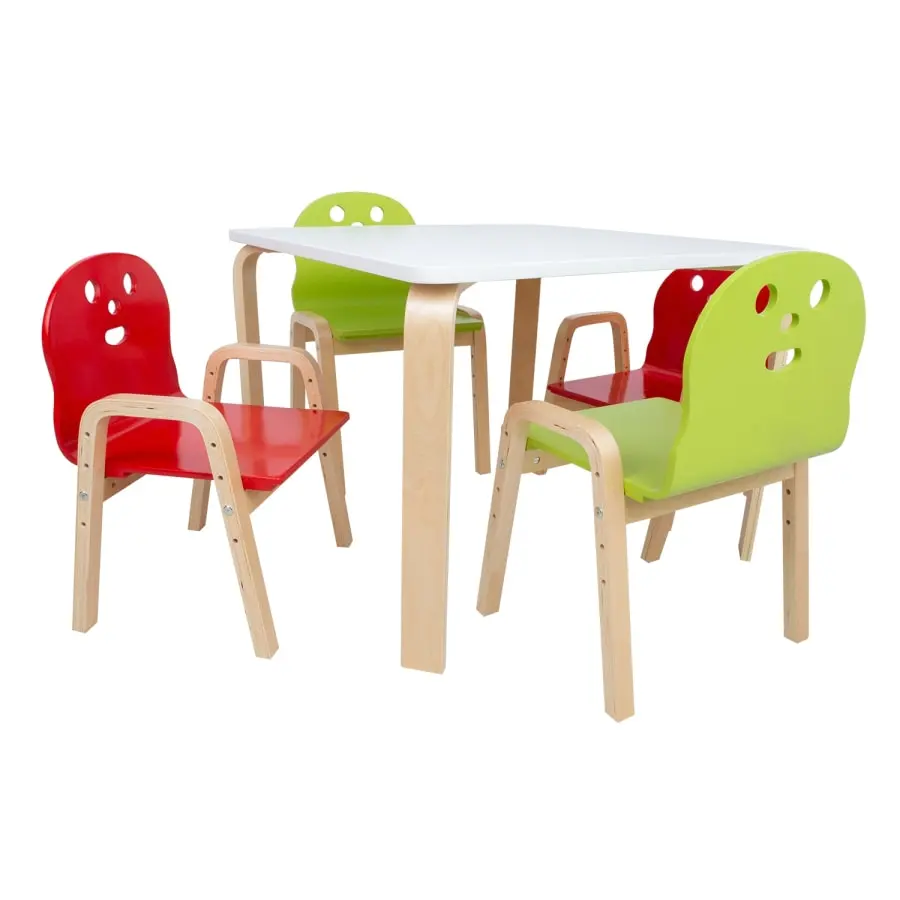 Barnset HAPPY bord och 4 stolar, vit/röd/grön. Måtten på bordet är 75x75xH50cm. Material: poppelplywood och björkfanér. Bordsskivan är vitmålad. De böjda plywoodbenen är avslutade med naturlack. Stolen HAPPY växer med ditt barn! Höjden på sitsen kan ökas fyra gånger efter barnets längd – 21/25,5/30/34,5 cm. Stolens totala mått är 39x36xH46,5/51/55,5/60cm. Sittbredd 33 cm, sittdjup 31 cm, ryggstödshöjd 27 cm, armstödshöjd från marken 36 cm. Material: böjd poppelplywood med björkfanér. Sätena är målade röda och gröna, ben och kropp är målade med naturlack. Viktgräns 40 kg.