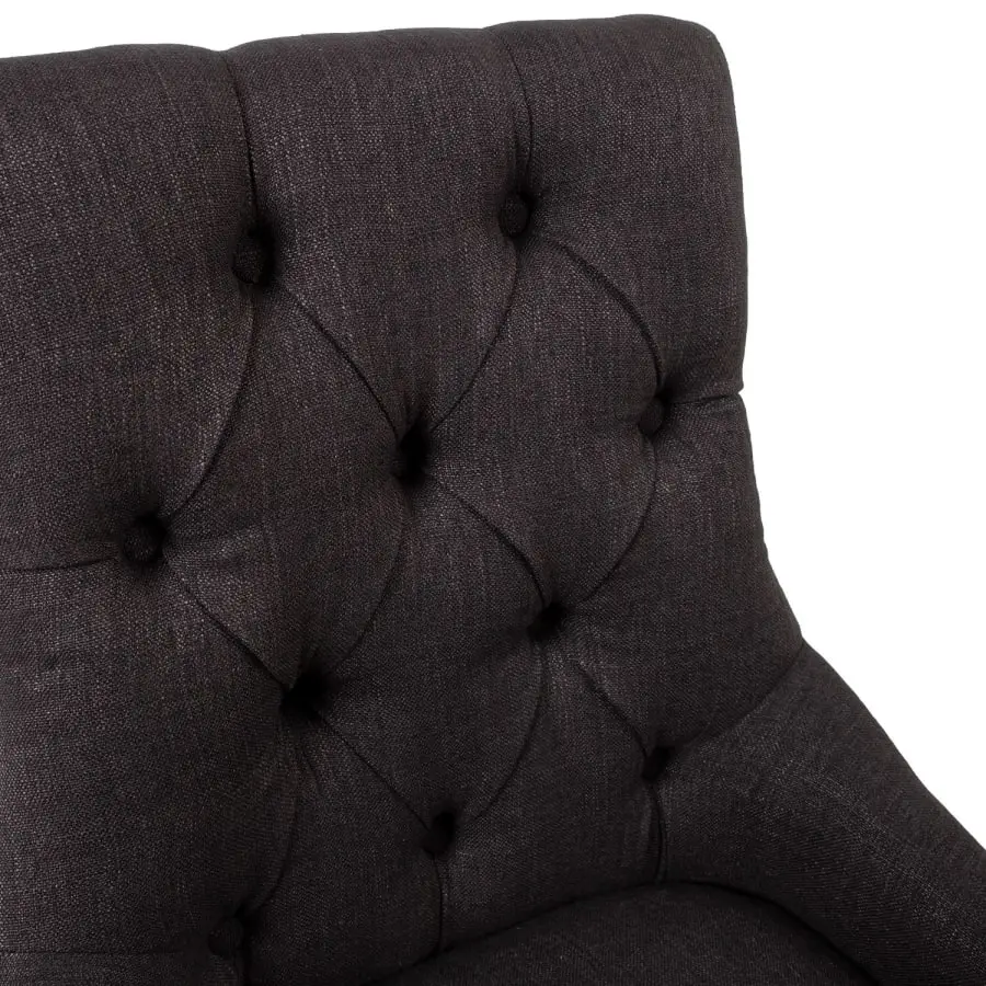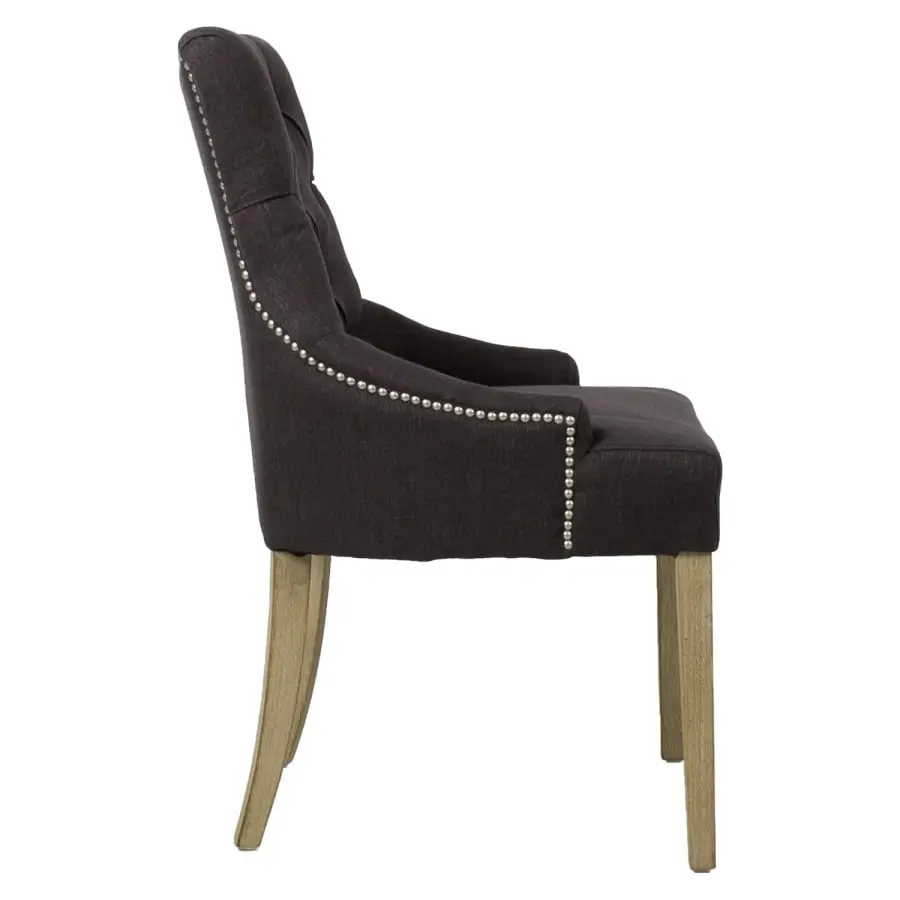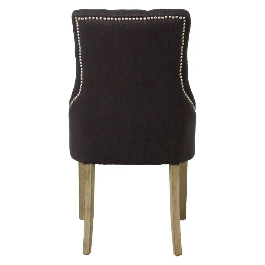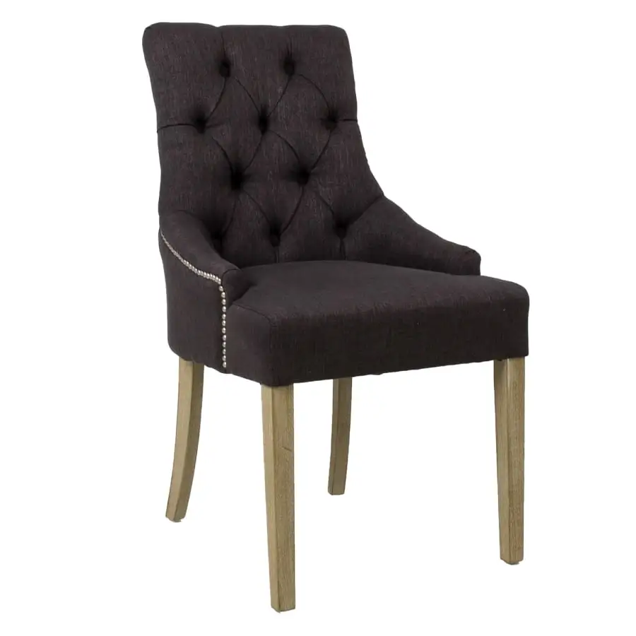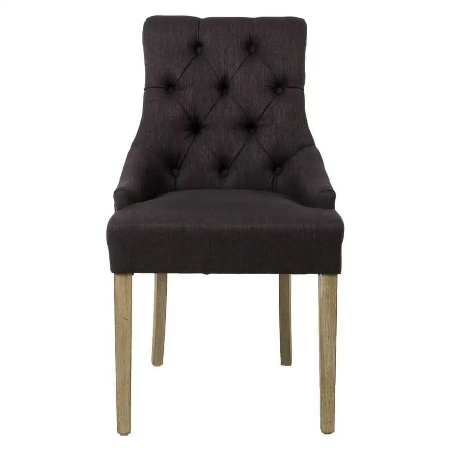 A luxurious chair by Homes with a beautiful decorative button. The frame is wood. Upholstered with 100% polyester. Wooden legs.