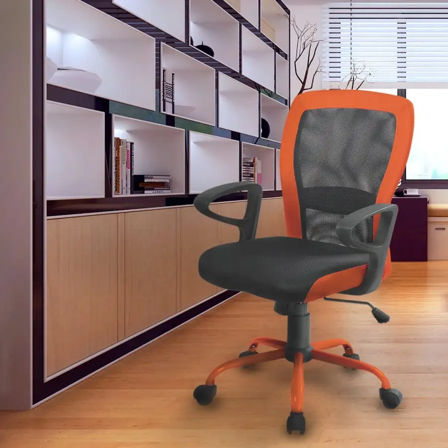 Adjustable office chair Leno. Swing mechanism, the stiffness of the swing can be adjusted based on the weight of the sitter. Seat height adjustable with gas spring. Steel footrest and plastic armrests. Seat covered with polyester fabric and backrest with breathable polyester mesh fabric. The edges of the backrest are artificial leather.
