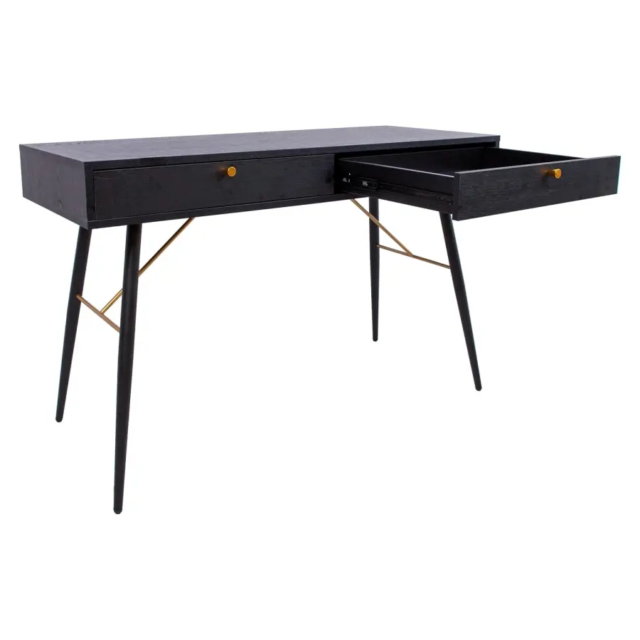 Ett skrivbord är ett nödvändigt tillägg till varje hem, vilket gör att du kan använda datorn mer bekvämt eller skapa ett praktiskt hemmakontor. Skrivbordet är tillverkat av melamin och underredet av metall. Bordet har mjukstängande lådor och kopparfärgade aluminiumhandtag.