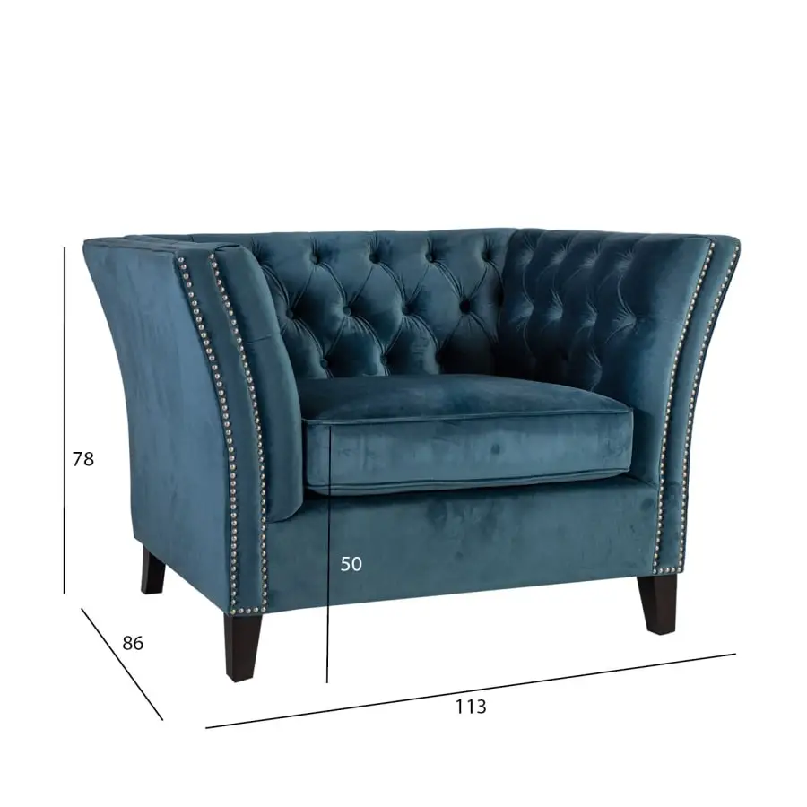 Stylish velvet armchair Mayers with beautiful decorative buttons. Wooden frame. Zig-zag and pocket suspension. Padding polyurethane foam 30kg/m³ and upholstery 100% polyester. Wooden legs.