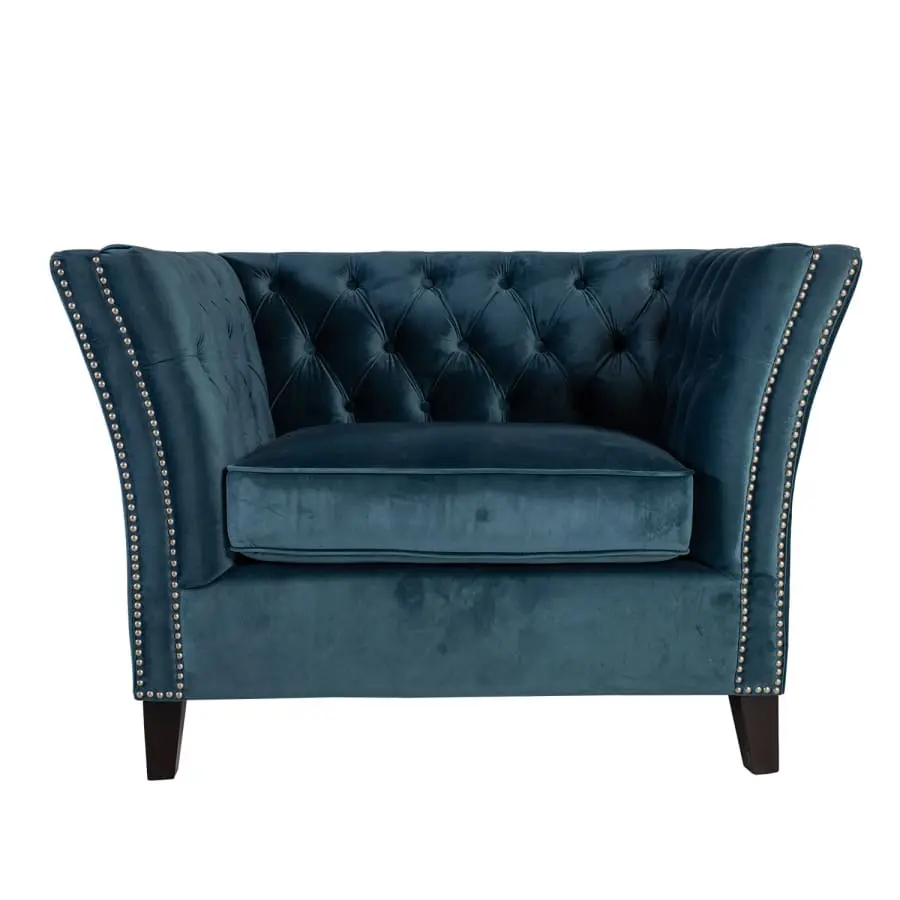 Snygg sammetsfåtölj Mayers med vackra dekorativa knappar. Träram. Sicksack och fickupphängning. Vaddering polyuretanskum 30kg/m³ och klädsel 100% polyester. Träben.