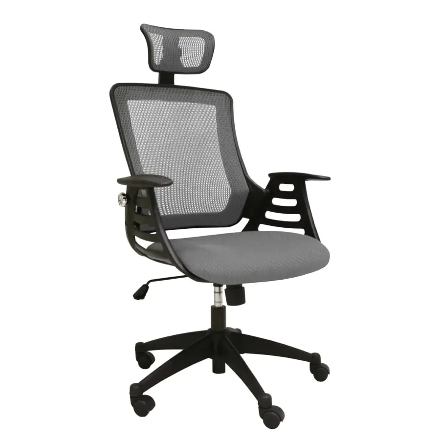 Adjustable office chair Merano with headrest. Swing mechanism, the stiffness of the swing can be adjusted based on the weight of the sitter. Seat height adjustable with gas spring. Plastic footrest and armrests. Seat and back in polyester mesh fabric, 30,000 Martindale.