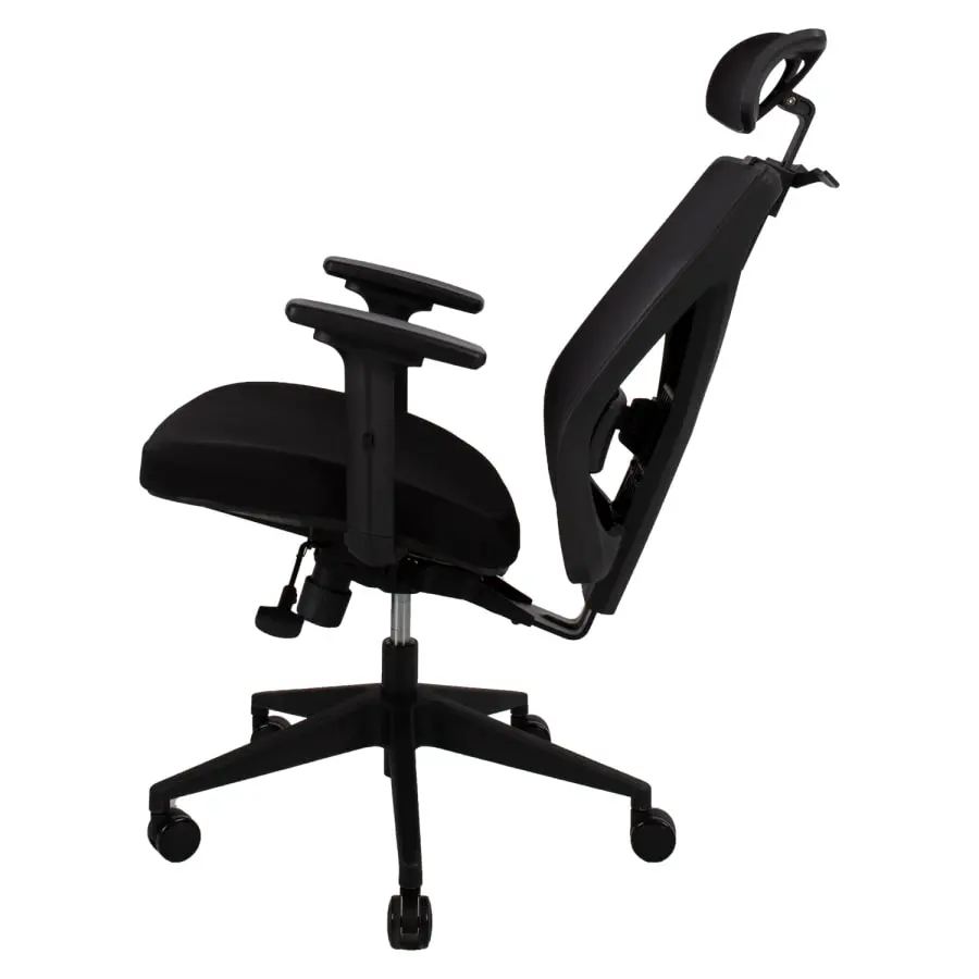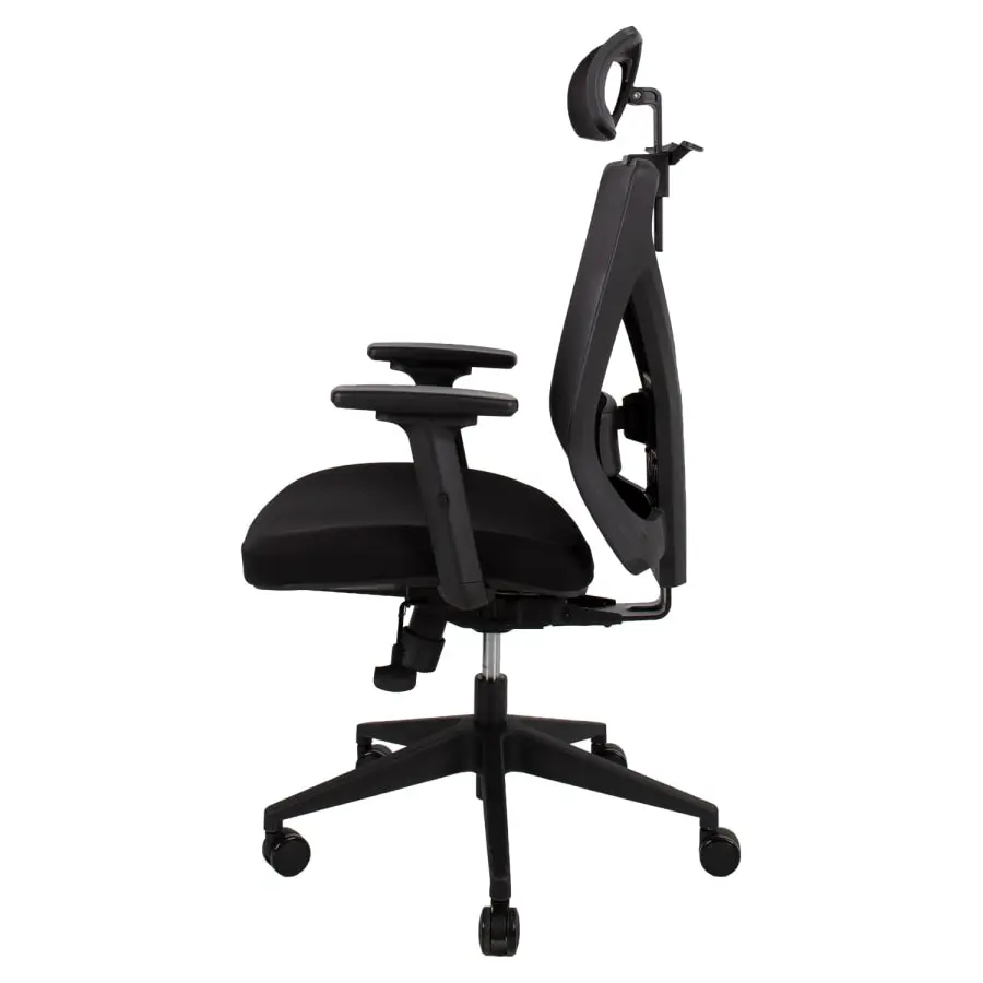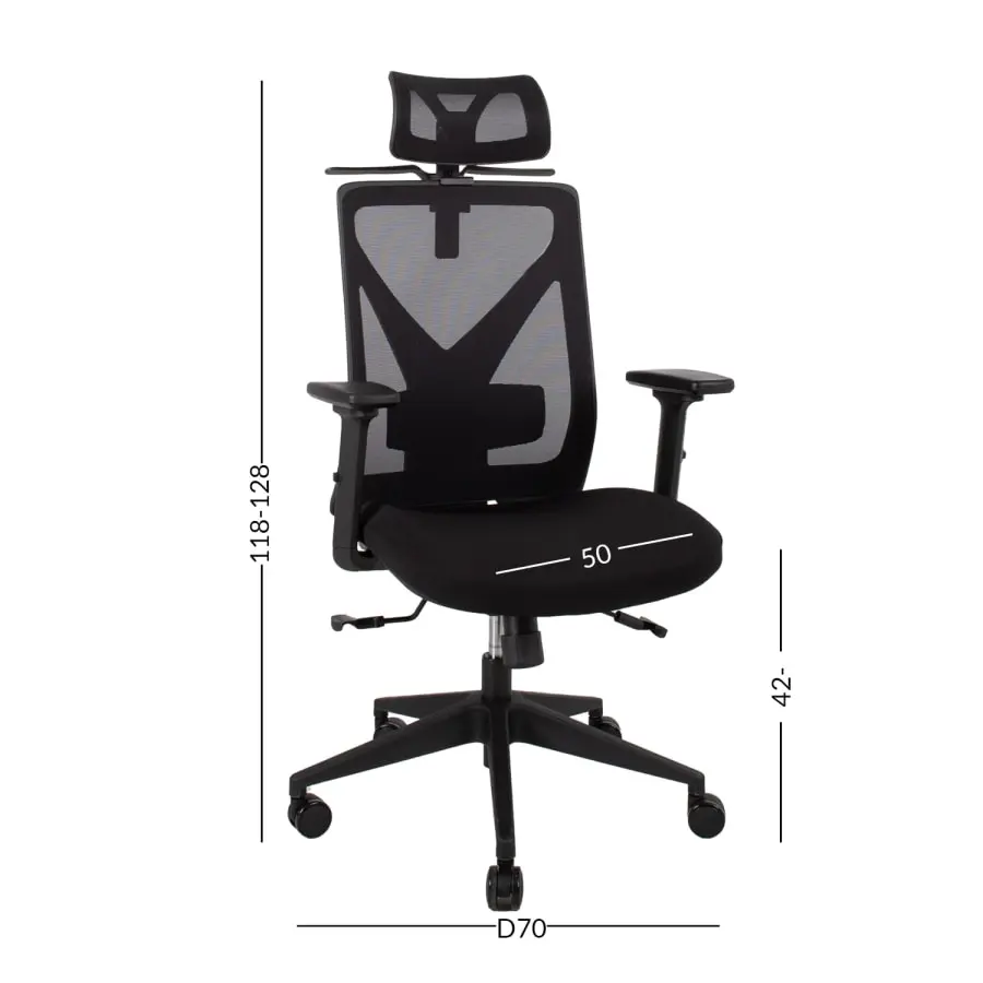 Adjustable office chair Mike. Seat upholstery material: polyester. The backrest and headrest are covered with mesh fabric. The ergonomic backrest is made of black plastic. Mechanism and adjustments: multifunctional mechanism, lockable in four positions. Backrest height adjustable. Adjustable backrest tilt angle. Seat depth adjustable +4.5cm. Seat height adjustable with gas spring. Armrests in black plastic, padded with polyurethane. The height of the armrests is adjustable. Freely tilting headrest, height adjustable. Black plastic leg cross R34cm, 60mm plastic wheels.