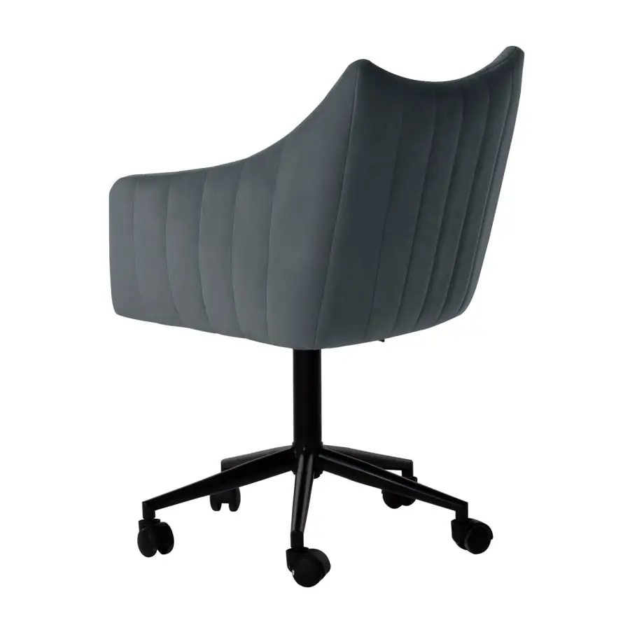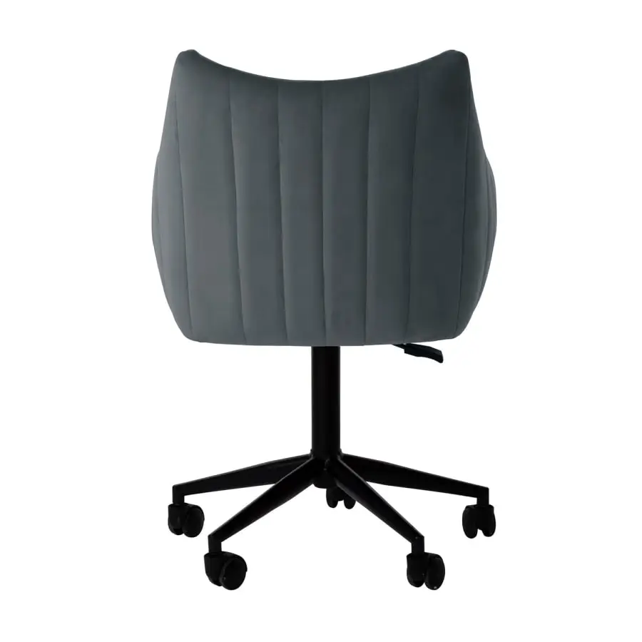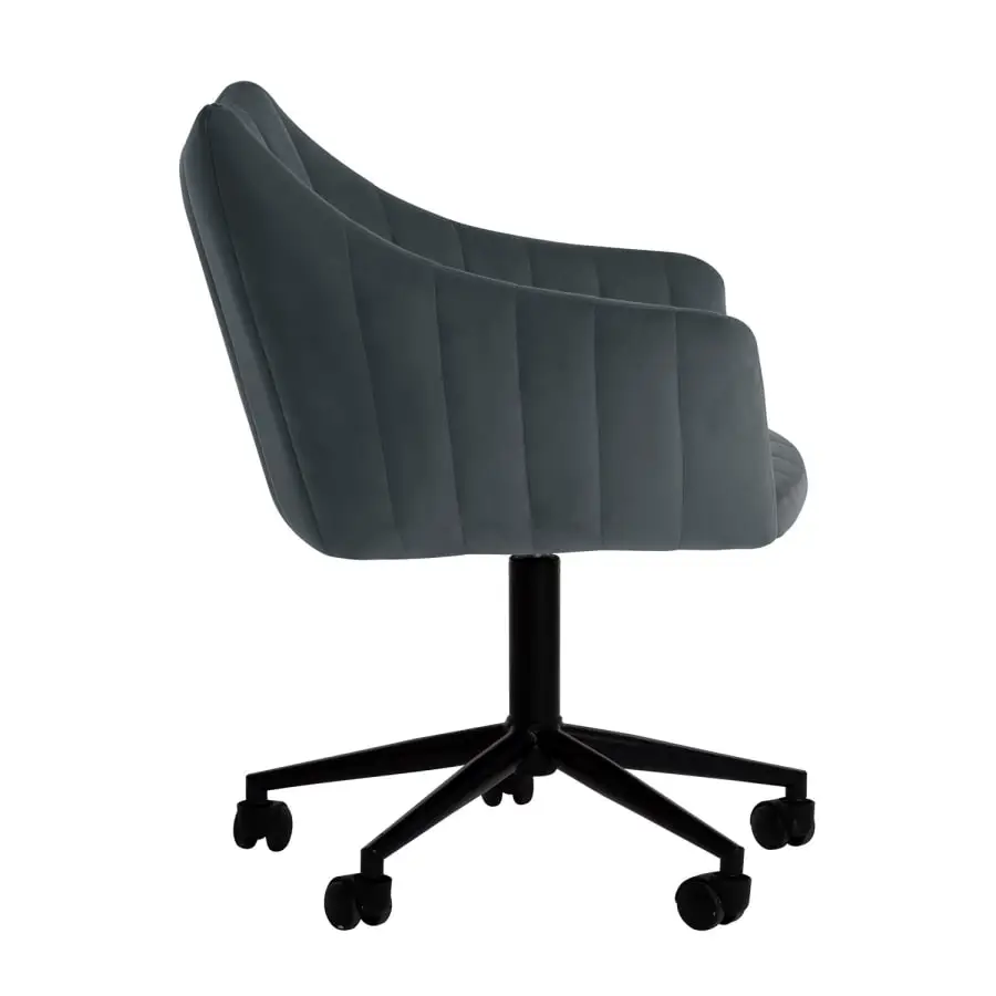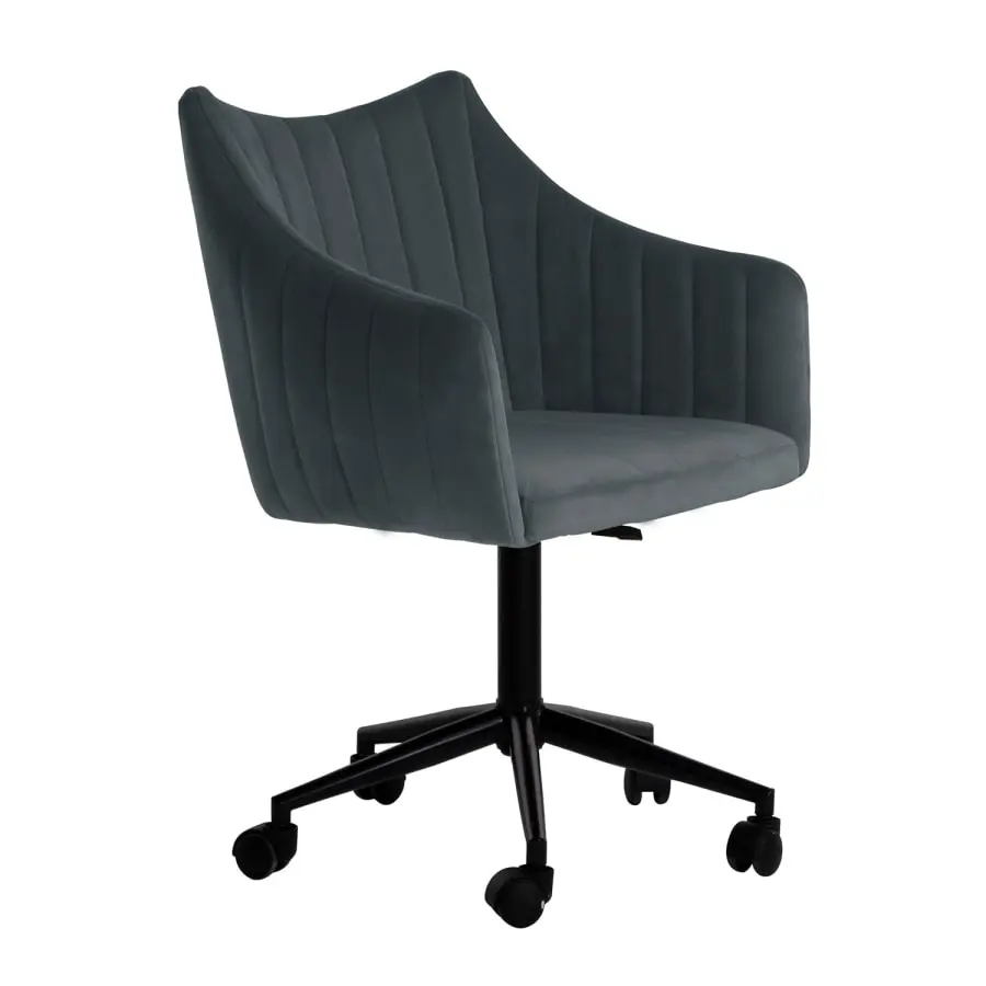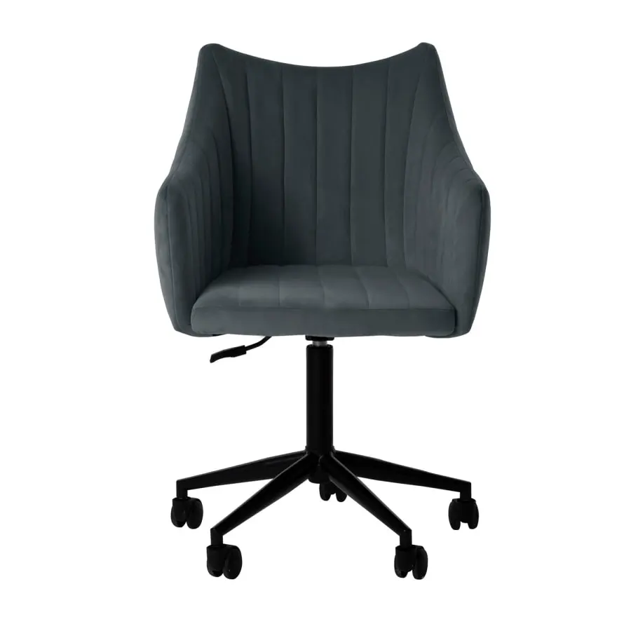 Näyttävä toimistotuoli yksinkertaisella muotoilulla on loistava valinta kotitoimistoon. Tuolin korkeus on säädettävissä. Tuolin istuin on kevyesti verhoiltu ja päällystetty harmaalla samettikankaalla. Päällystemateriaali: 100 % polyesteriä, 260 g/m². Martindale 25 000. Pyörillä varustettu 5-puikkinen ristijalka ja tuolin jalka on valmistettu metallista ja päällystetty mustalla pulverimaalilla.