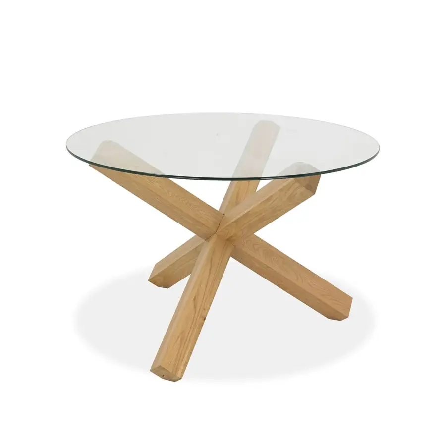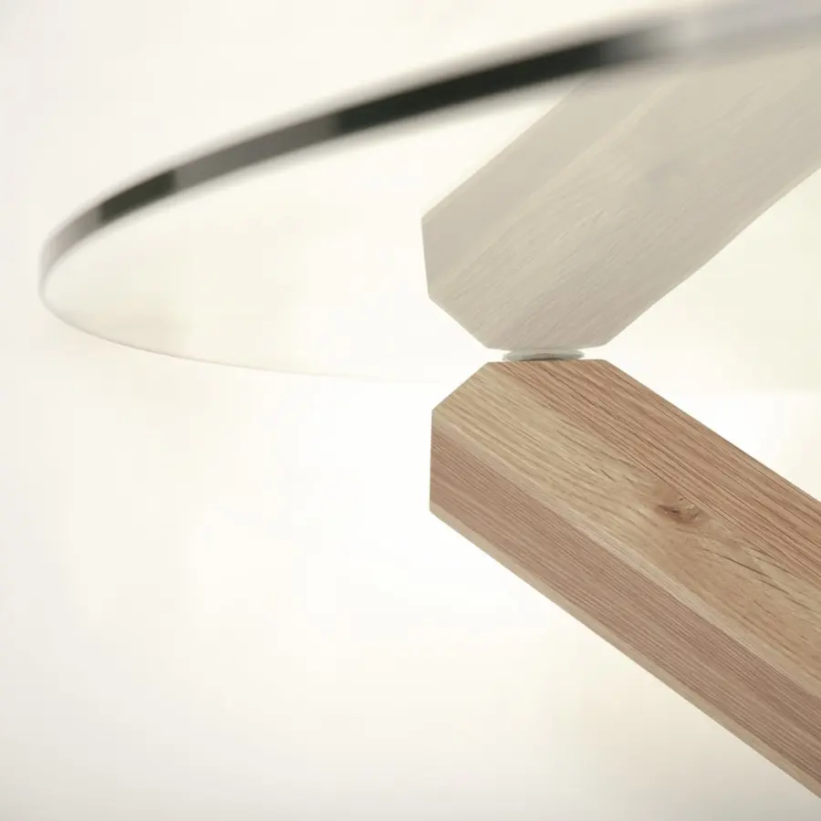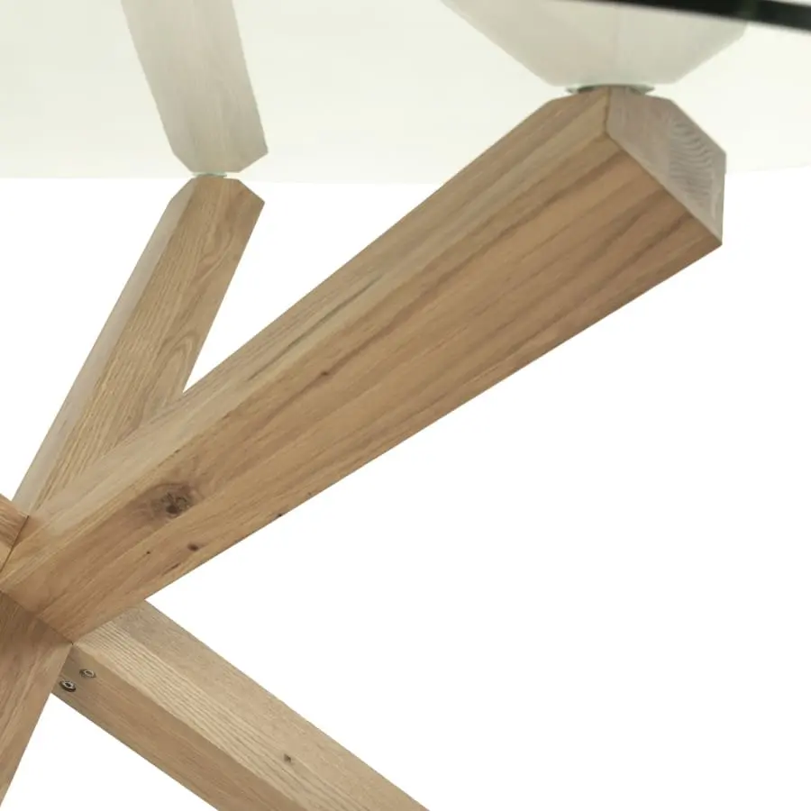 A lovely dining table from Turin, with beautiful wooden legs. The table top is clear glass. Cross legs made of oak and finished by oiling.