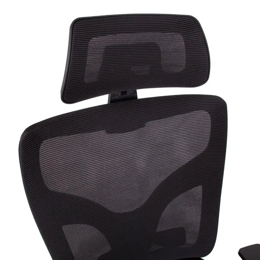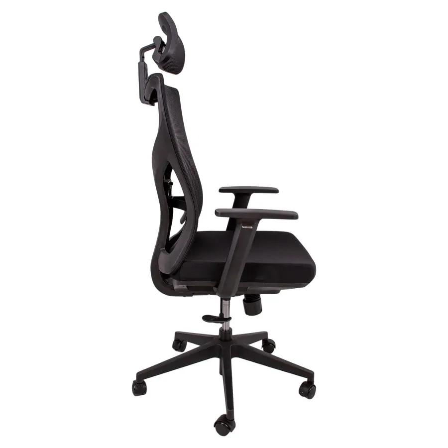 Istuin on päällystetty polyesterikankaalla, 50 000 Martindalea. Selkä- ja niskatuki on päällystetty polyesteriverkkokankaalla, 30 000 Martindalea. Tuolissa on kallistusmekanismi, lukittava yhteen asentoon. Säädettävä ristiseläntuki. Pneumaattinen istuimen korkeuden säätö. Runko ja selkänojan runko on valmistettu mustasta muovista. Käsinojat ovat kiinteät. Pääntuen korkeus ja kulma on säädettävissä. Musta 5-piikkinen muovijalusta, R34cm. Nylon pyörät, 50mm. Korkeus 94-100,5cm, istuimen leveys 49cm, syvyys 48cm, istuinkorkeus 45-54cm.