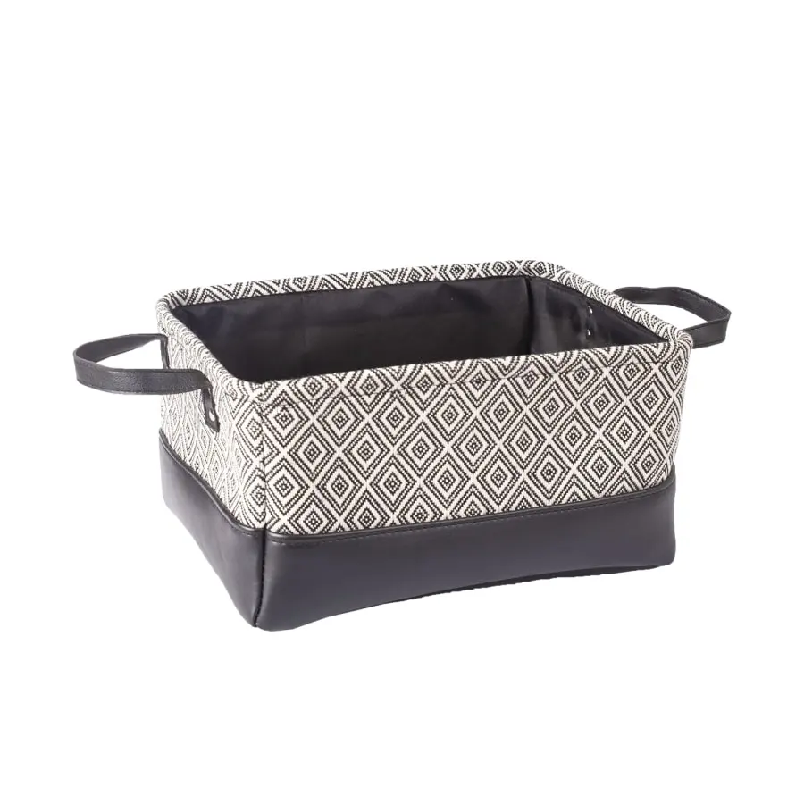 Basket YANA-3, 36x26xH20cm, black and white pattern. Material: polyester and polyurethane storage basket. Black handles.