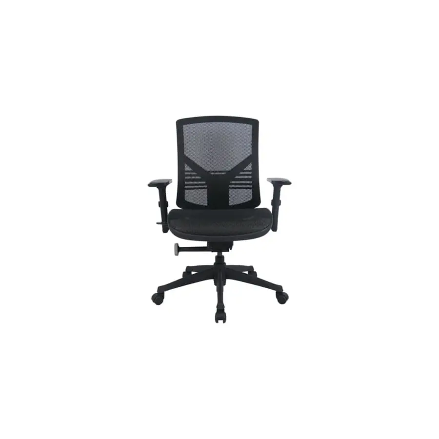 Kontorsstolen med höj- och sänkbara armstöd har svankstöd och justeringar för både sitthöjd och ryggstödslutning.