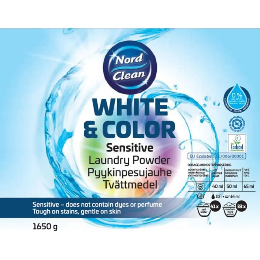 Nord Clean universal laundry powder for washing both colored and white textiles in a machine or by hand. The laundry liquid is concentrated and gives up to 41 washes from one package. Does not contain colorants or perfumes so it is suitable for everyone. Does not contain zeolites. Ecolabel and Nordic Asthma and Allergy labels.