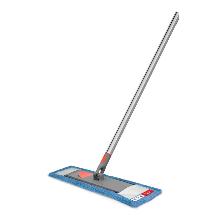Nordic Stream multi-functional mop for wet and damp mopping. The length of the telescopic arm can be adjusted from 90 to 160 cm and is made of stainless steel. The handle attaches to the mop head with Quick Click. The ergonomic plastic parts provide a firm grip. Thanks to its joint, the mop head can be folded in all directions and wiping is also easy from low places. Thanks to its pockets, the microfiber textile mop stays firmly in place and it is easy to remove by pressing the red locking mechanism. The textile mop can withstand 60 C° water washing. Thanks to the hole at the end of the telescopic arm, it is easy to hang the mop on a spike for storage.
