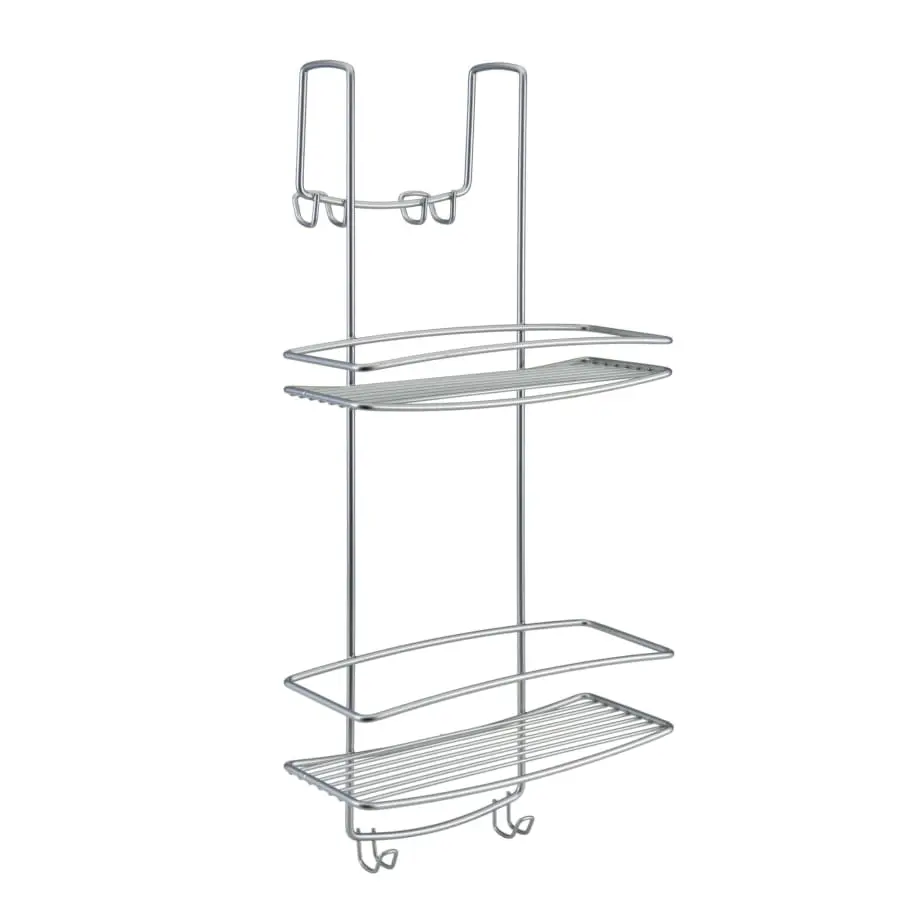 2-level shower shelf. The shelf is not attached to the wall, but is raised, for example, on top of the shower wall, in which case there are shelves on one side and towel hooks on the other. Dimensions: Height 60 cm and width 26 cm.