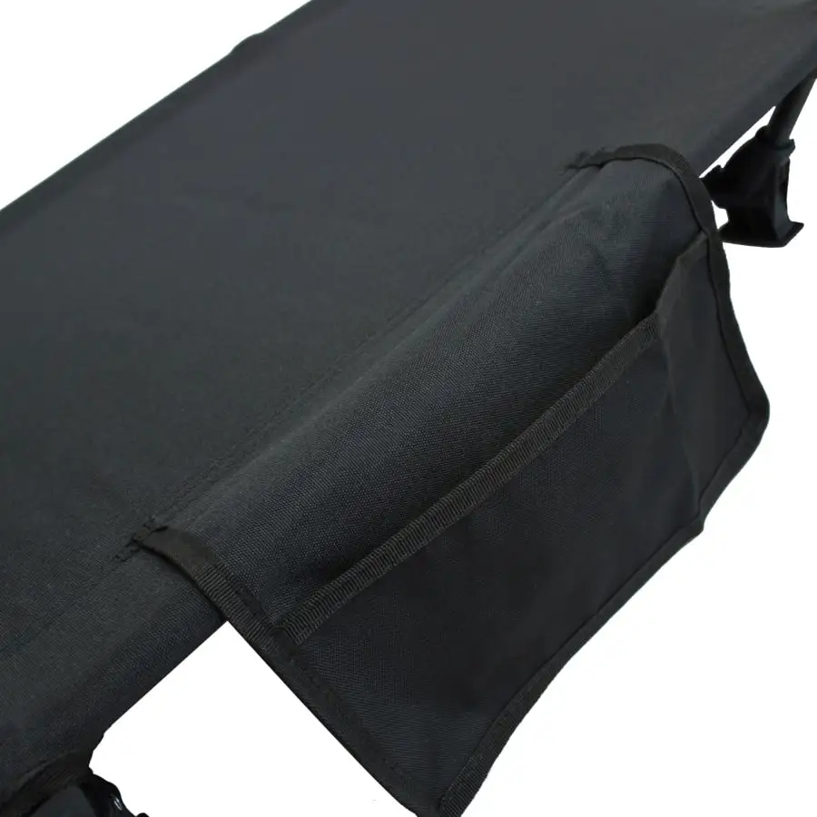 The capacity you can safely load on the bed is even 130 kg, so it’s a great and sturdy choice for most people in need of a camping cot. The side of the open bed has a small storage bag where you can place your cell phone for example during the night.