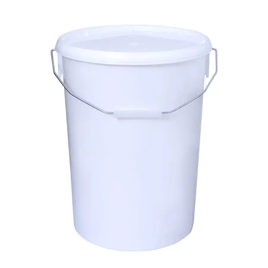Plastopak 20 liter white storage bucket with lid. A metal headband on the handle. The food is suitable for use and dishwasher safe.
