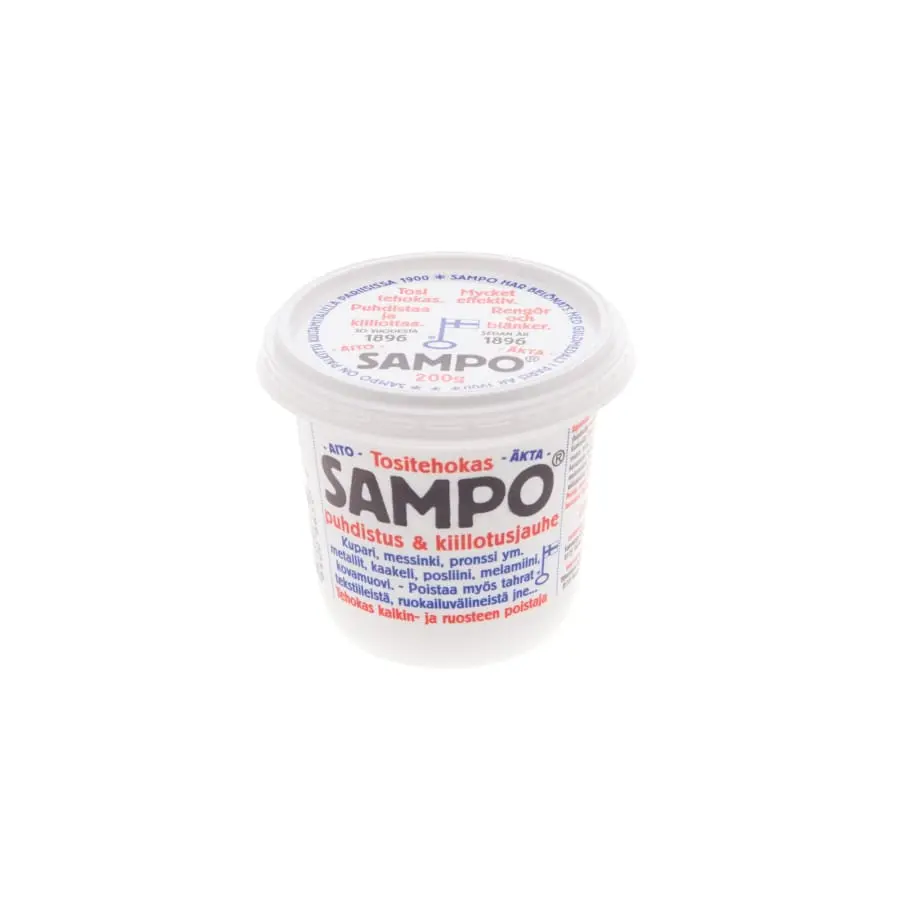 - Käyttöohje: Paina kostea sieni, kangas tai harja Sampo- jauheeseen ja hankaa lämpimällä vedellä kostutettua kohdetta hyvin. Huuhtele lämpimällä vedellä ja kuivalla kankaalla.