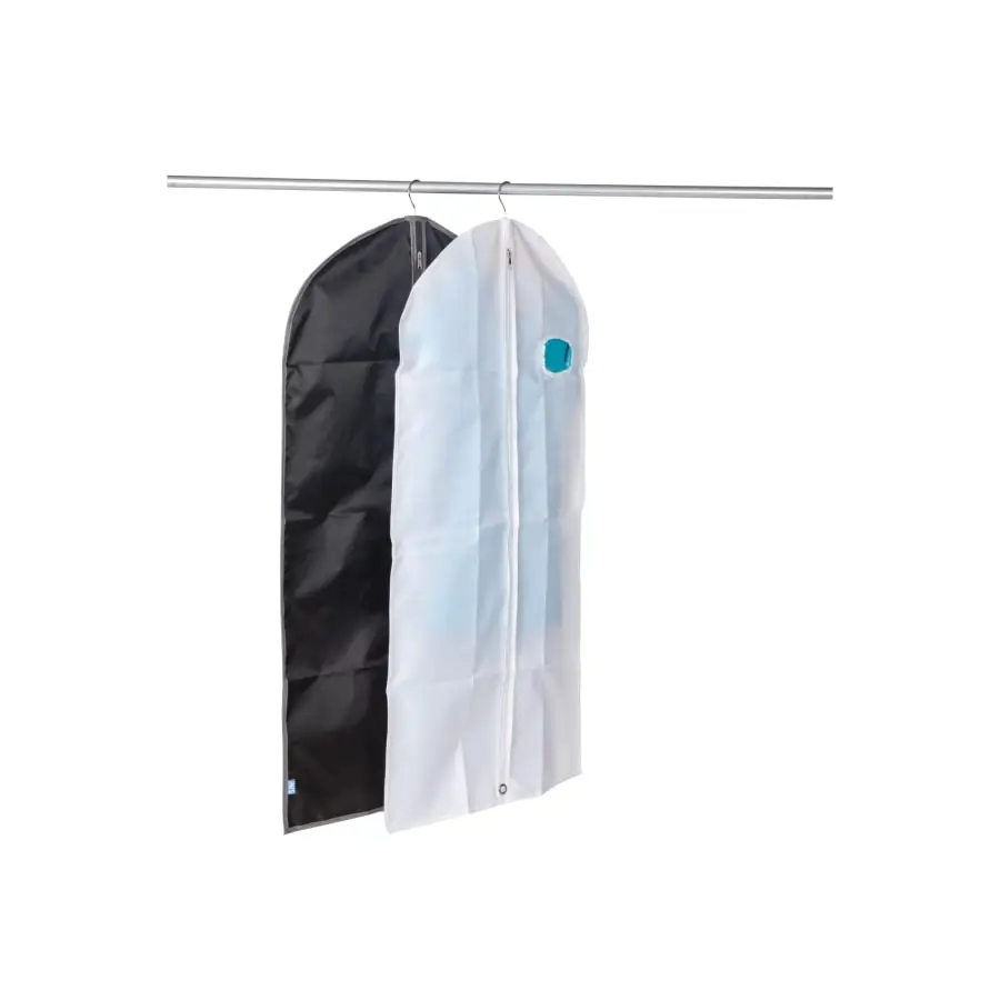 The short suit bag (110 x 60 cm) is excellent for storing shirts, skirts and suits in the wardrobe, closet or warehouse. The bag protects the clothes from dust and dirt. It is also easy to take with you on a trip, because it can be folded in half. The top of the bag has an opening for a hanger. There is a window on the front of the suit bag that shows the contents of the bag. The bag is made of high-quality polyester, so it can also withstand frost. If necessary, you can wipe the suit bag with a damp cloth. A sturdy zipper and strong edge supports ensure the durability of the product. The suit bag has a five-year warranty. The bag is available in black and white. You cannot choose the color when ordering from the online store.