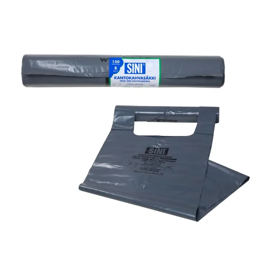 Bärhandtagssäcken är en 150-liters stark avfallssäck med lätta att knyta fast bärhandtag. Den tåliga bärhandtagssäcken är gjord av extra stark återvunnen plast, så den håller även bra för tungt avfall, som trädgårdsavfall och grenar.