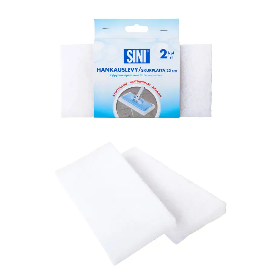 Med den 23 cm breda skurplattan som kan fästas på handfatet i badrummet eller en liten universalmopp kan du effektivt och utan att repa fast fastsatta fläckar från golv och andra ytor som tål vattentvätt. Skursvampen kan användas för att tvätta vattenbeständiga målade ytor, glasytor, kakel och klinker- och klinkergolv. Den kan även användas för grundlig rengöring av plastmattor. Efter användning, skölj med rent vatten och lufttorka.