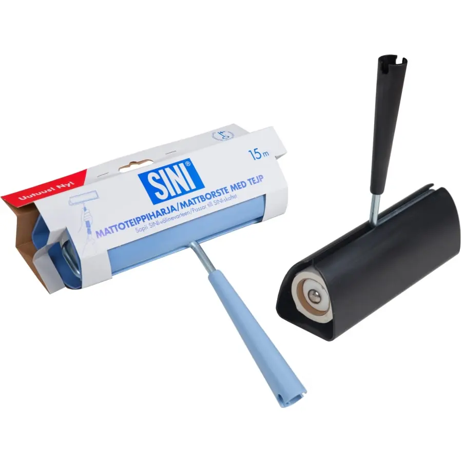 Matttejpborstens 20 cm breda spårliknande rulle har 10 meter tejp och färdiga snitt där den använda tejpen kan rivas av. Matttejpborsten kan kombineras med alla SINI verktygsarmar, så mattrengöring kan göras utan att böja sig.