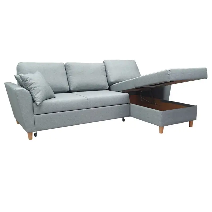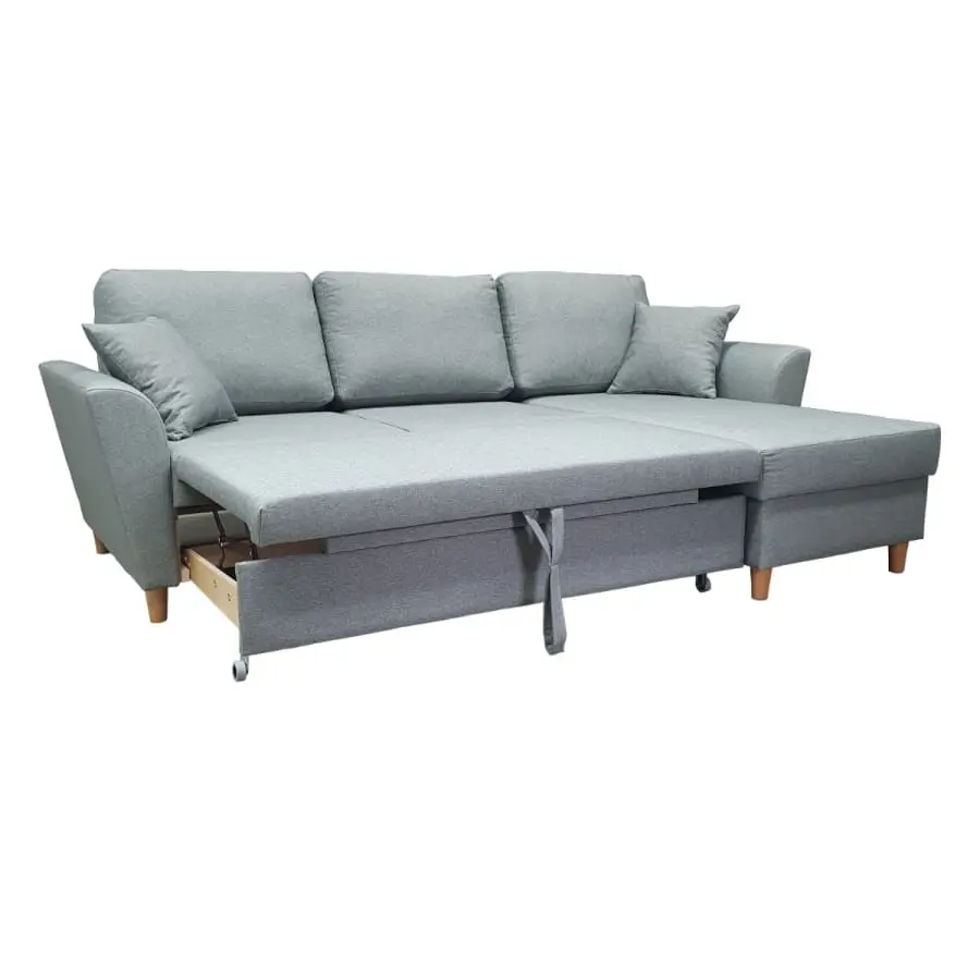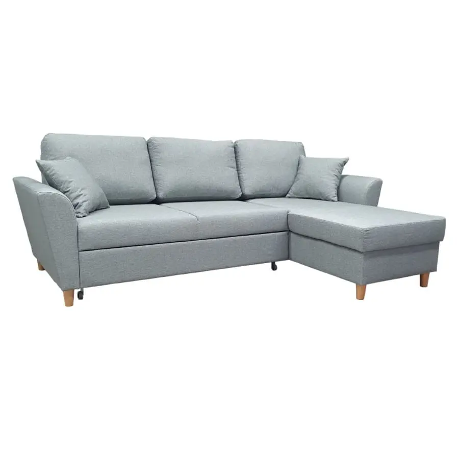 The frame of the product is solid wood and birch plywood. (does not include chipboard) Natural color varnished wooden legs, height 10 cm. Zig-zag suspension in the seat parts. Load-bearing foam in the seats E30kg. Seat structure 15 cm high. Back pillows made of hollow fiber wadding and foam, pillow thickness approx. 15 cm. The seat cushions are upholstered and the back cushions are reversible, upholstered on both sides. The bed part is upholstered in the same fabric as the sofa. Samoa dirt-repellent furniture fabric, color 11 light gray. Technical data of the fabric: Abrasion resistance: max 40,000 Martindale see the technical data of the fabric pdf.