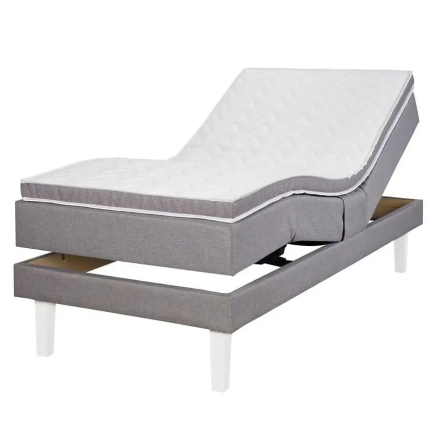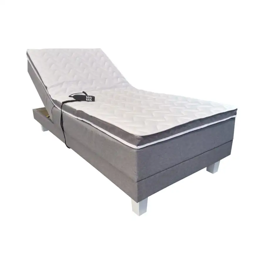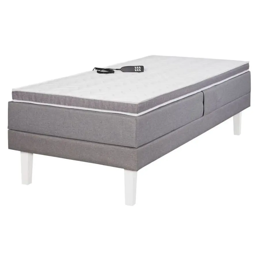 Snygg motorsäng med kraftig träram och slitstarkt Malmö klädseltyg. Det höga vita träbenet gör det lättare att dammsuga under sängen. Fjärrkontrollen har tre olika inställningar, du kan justera sängen till exakt den position du vill ha. Sängen har pocketfjädrar i madrassdelen med 278 fjädrar/m2. I paketet ingår ben, fjärrkontroll och en viskoelastisk övermadrass.