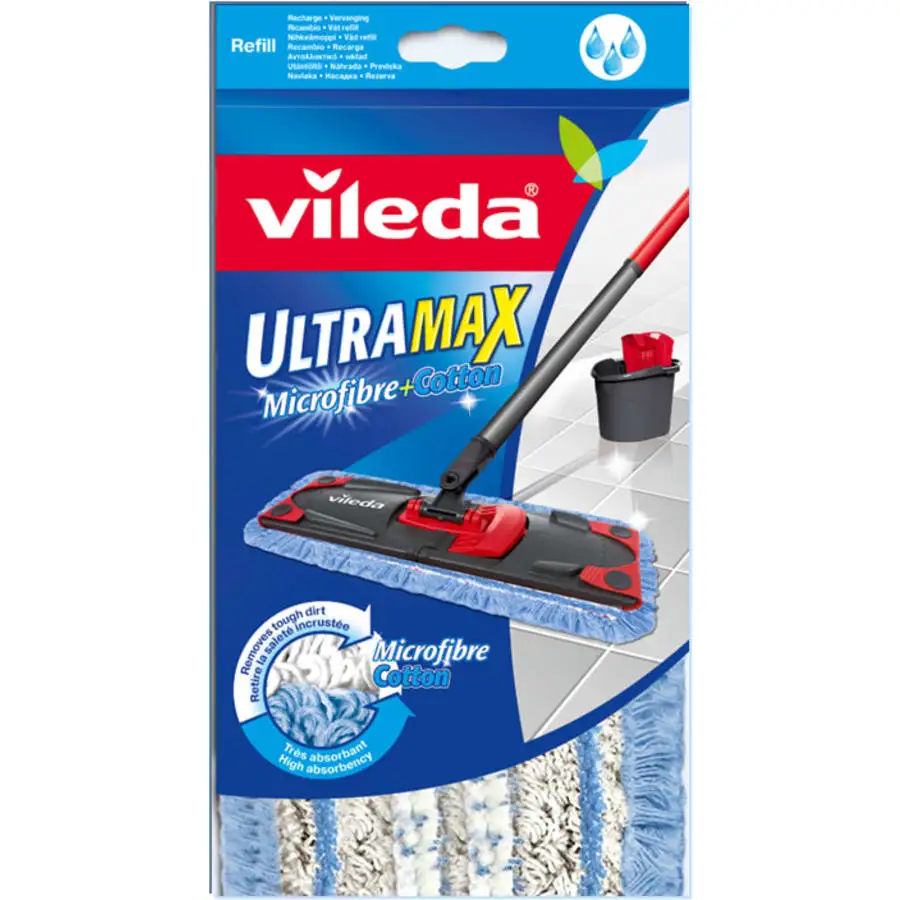 Microfibre + cotton replacement mop for Vileda UltraMax plate frame mop. Suitable for damp and wet cleaning of waterproof materials, clinker and plastic carpet. The replacement mop is made of microfiber, which easily cleans stubborn dirt, and highly absorbent cotton. The loops of the mop collect dust and dirt. The UltraMax Microfibre&Cotto replacement mop is suitable for the Vileda UltraMax sheet frame mop and the Vileda 1-2 Spray ready-to-use mop. Machine wash: 60°C, no fabric softener or tumble dryer.